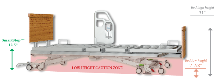 Smart Stop prevents falls by prohibiting the user from trying to egress from a dangerously too-low level. Lowering down into low height zone is only possible using the FEC. Flashing indicators display as bed goes into low height zone. Under-bed indicators can also be switched over to discreet nighttime floor level illumination.